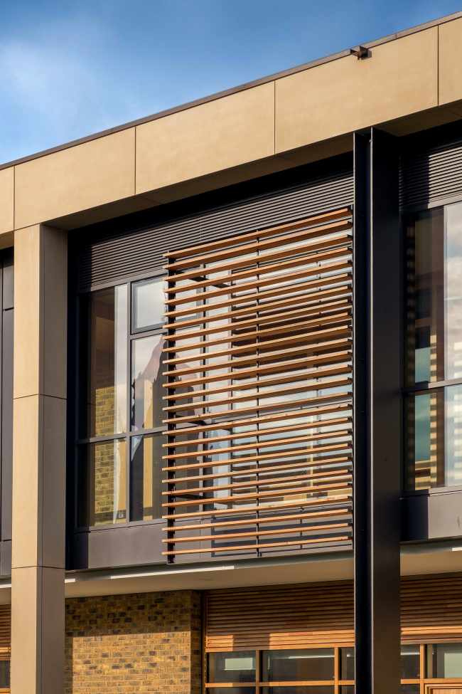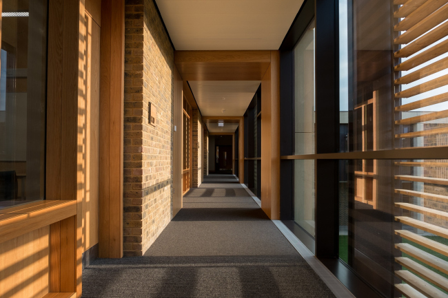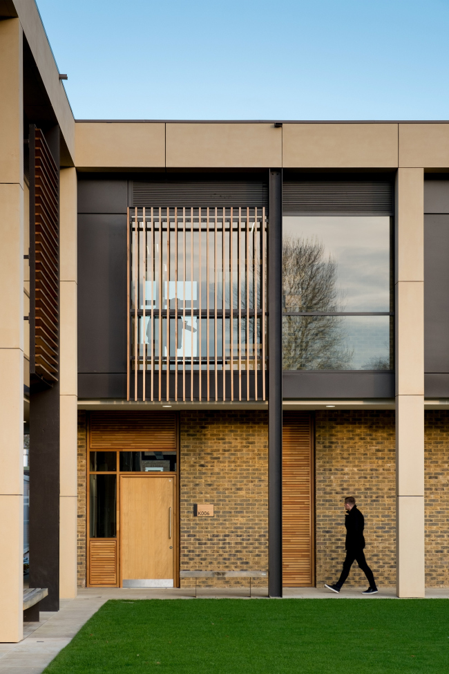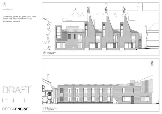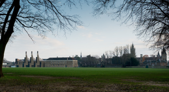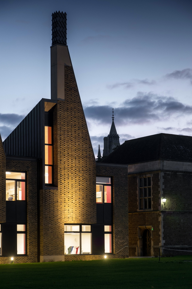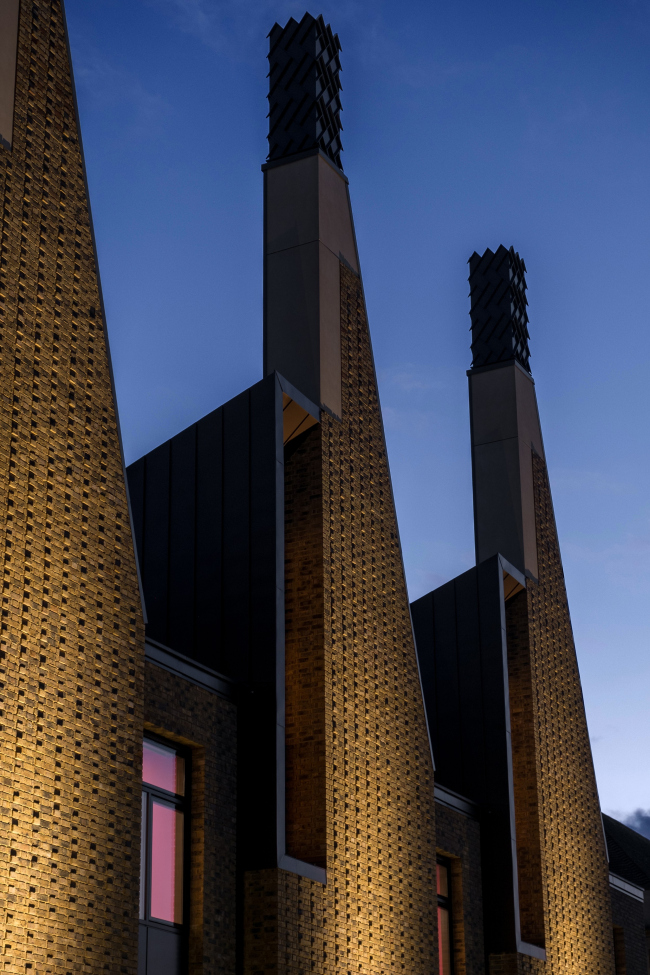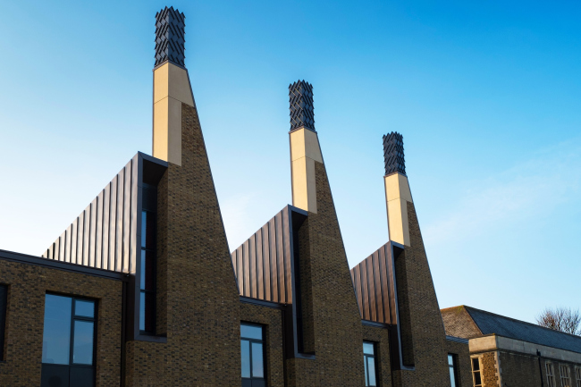 Вписать новую постройку в исторический контекст помогли кирпич и дерево, темный колорит, разные фактуры и даже орнаментальные мотивы, как на завершении самого яркого компонента – трех напоминающих дымоходы объемов на кровле: они не только создают нужные ассоциации, но и скрывают внутри необходимые для химических лабораторий вентиляционные системы.