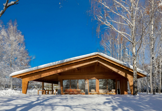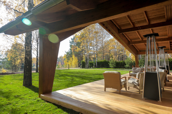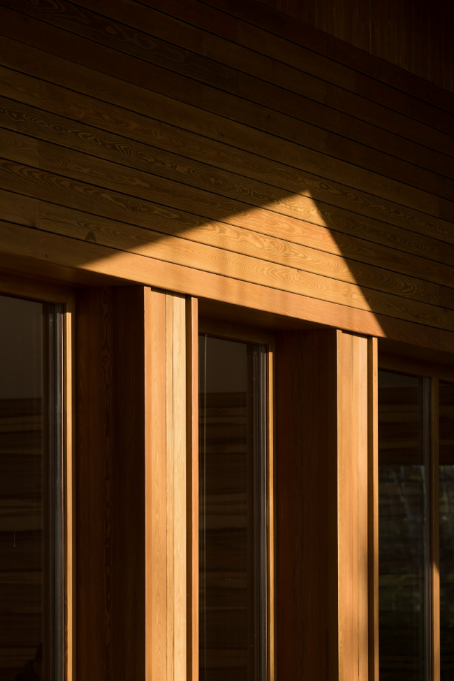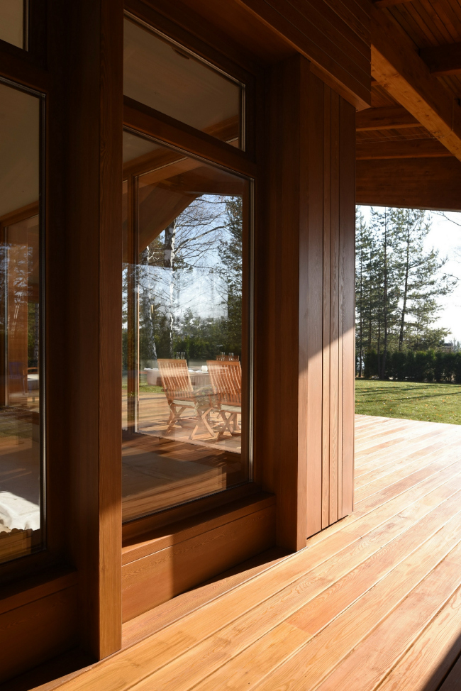 Но если чуть сместить фокус, на фасадах обнаружатся намеки на «городские» элементы: в чередовании узких и более широких реек, в горизонтальной и вертикальной укладке читаются пилястры, карнизы и капители. Опоры тут же становятся колоннами, потолок веранды оказывается кессонированным, а главному фасаду становится недалеко и до портика. Автор проекта Илья Самсонов рассказывает, что стремился создать «метафоры классических форм и игру недосказанности».