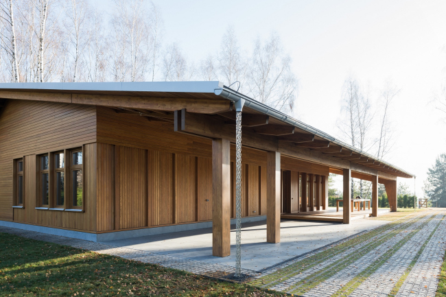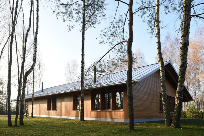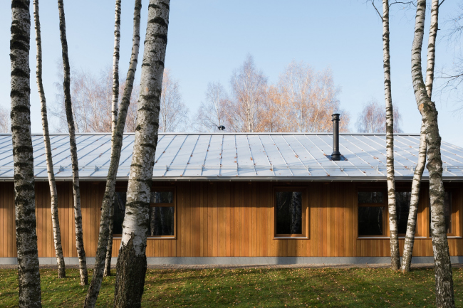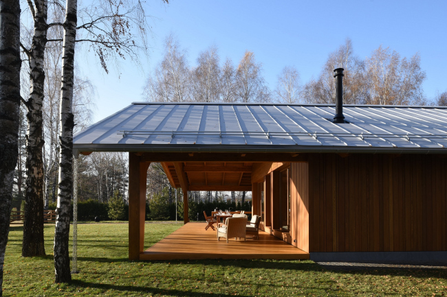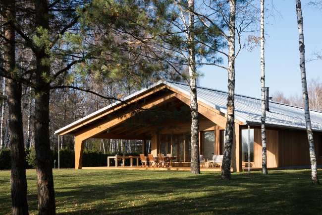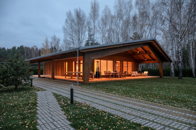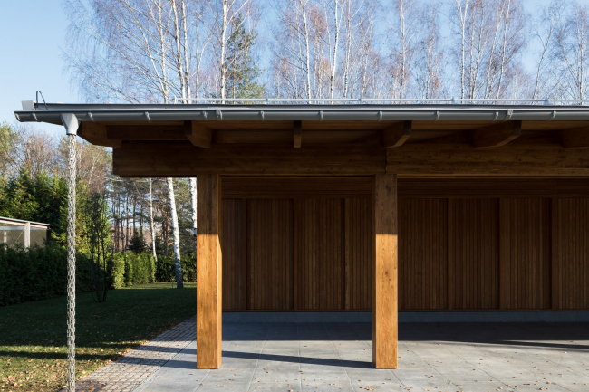 Дом состоит из лаконичного объема жилого «короба» и приставленной к нему углом террасы, все вместе накрывает двускатная крыша с широким разлетом и «причелиной», которая опускается довольно низко и переходит в коренастые опоры-пилоны. Терраса делится на зону для парковки машин – в этой части фасад сделан глухим, и зону отдыха, «веранду», где фасад остеклен наиболее щедро, впуская внутрь дома красоту окружающего леса и воды.