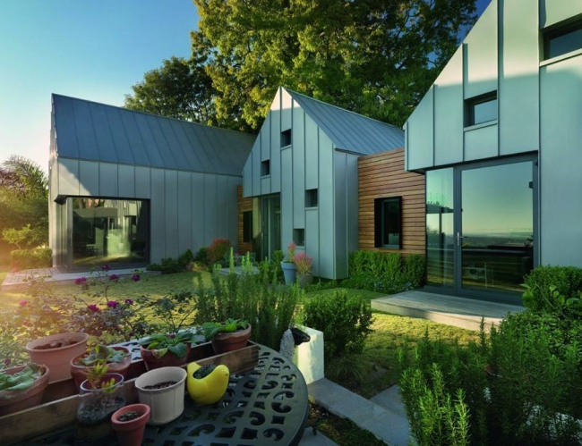 Сам дом решен в виде двух больших и нескольких малых павильонов, где для кровли и фасадов использован патинированный титан-цинк RHEINZINK-prePATINA blaugrau. Также были применены стекло, сталь и дерево. Получившиеся жилые модули выглядят, как целый поселок, причем озелененные пространства между ними архитектор трактует как «комнаты» под открытым небом. Титан-цинк придает постройке цельность и легкость облика, а также возможность менять образ: в зависимости от времени суток, погоды и сезона поверхность металла выглядит каждый раз иначе.