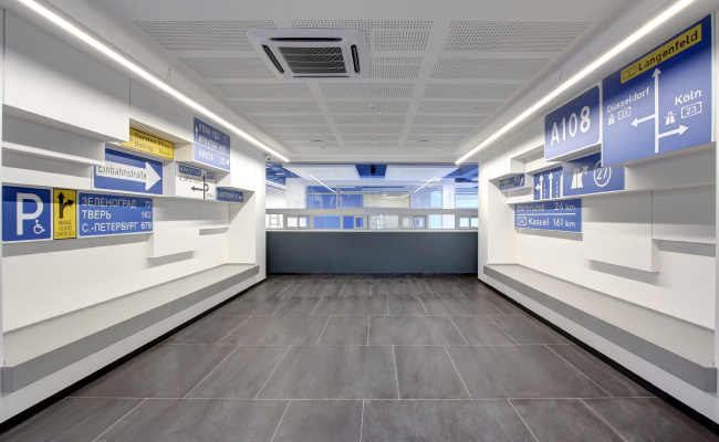Оформление зала ожидания для водителей вдохновлено дорогой: на стенах, выполненных в корпоративном синем цвете, размещены дорожные знаки и указатели.