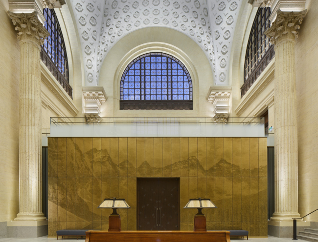 Стены двух средних комитетских помещений – поверх слоя звукопоглощающих материалов, не дающего шуму распространяться в огромных залах вокзала – закрыты бронзовыми перфорированными панелями, на которые нанесены как полутоновые изображения фотографии – виды канадских ландшафтов.