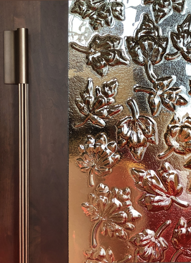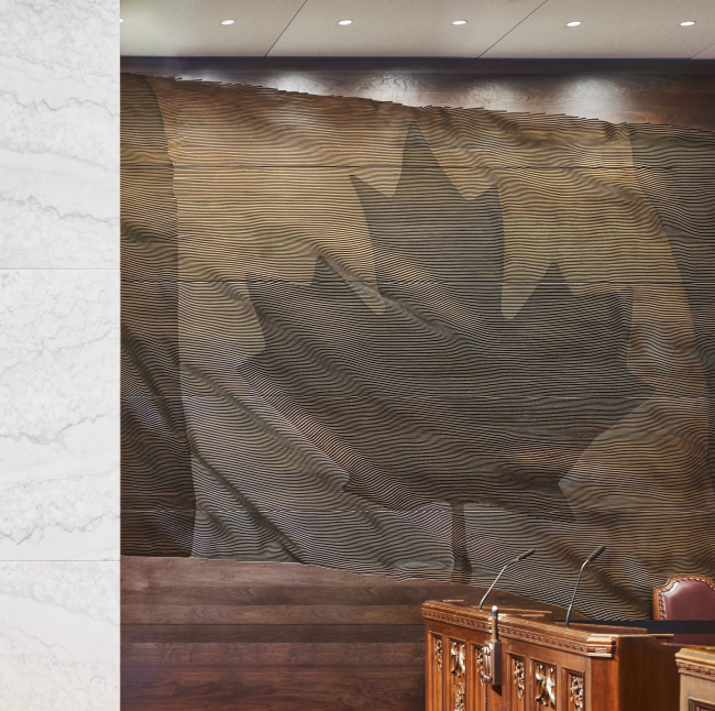 На дверях залов заседаний и комитетов из древесины каштана резьба была выполнена на станке с цифровым управлением, но изначальный мотив – листья десяти характерных для Канады видов клена – был изготовлен вручную , а потом считан 3D-сканером. Две фланкирующие «Трон» спикера деревянные панели покрыты изображением канадского флага, причем иллюзию цвета и рельефа создает игра света и глубина нажима резака цифрового станка.