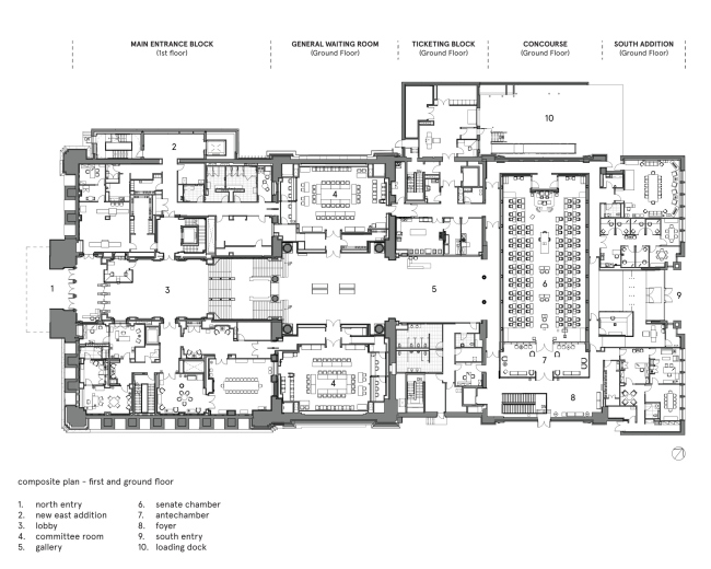 Новый облик получил восточный фасад, изначально оставшийся неразработанным. Зал заседаний встроили в основной зал вокзала (concourse), помещения для комитетов – в зал ожидания и кассовую зону. Все это вставные конструкции, и их «инсталляционный» характер особенно заметен у средних помещений комитетов, которые выглядят как обшитые бронзой блоки внутри зала ожидания.