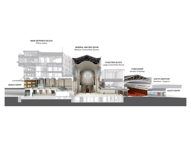 Архитекторам Diamond Schmitt и KWC было поручено расположить в здании зал заседаний для Сената, большое и два средних помещения для комитетов, различные вспомогательные, а также общественные зоны, которые были особенно важны, потому что здание было закрыто для публики с 1966.
