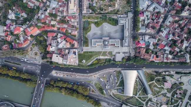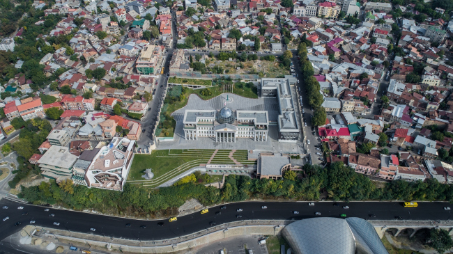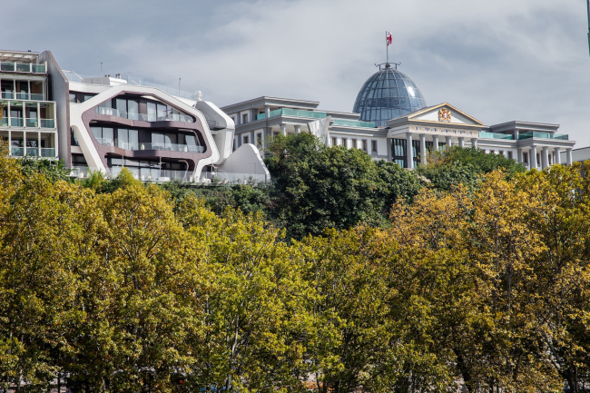 Интерьер организован вокруг внутреннего двора – открытого ядра здания, однако помещения также обращены к южному фасаду с видом через реку Кура на историческую часть Тбилиси. Эта сторона постройки получила балконы-террасы и кадрирующую эту панораму «скелетообразную» структуру.
