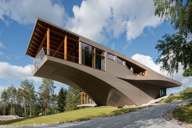 авторское описание: «Усадьба Клаугис расположена в вблизи города Мадона (Латвия) в живописном месте на берегу лесных озер и состоит из нескольких зданий. Комплекс усадьбы состоит из подчеркнуто разных зданий: Семейного Дома, Гостевого Дома, Дома Детей, Выставочного Зала, Банного комплекса, пешеходных мостиков, связывающих здания, а также дома охраны. Все здания органично вписаны в ландшафт. Рельеф местности и существующая растительность максимально сохранены. Одной из основных задач проекта было – не навредить природе, но усилить впечатление от пейзажных панорам, поэтому здания находятся на местах стоявших ранее здесь построек схожего назначения.