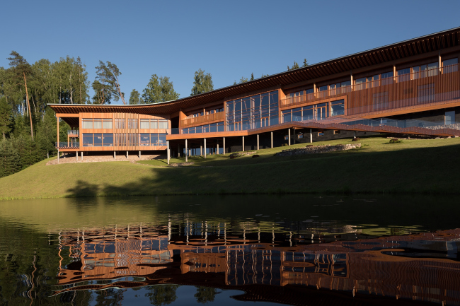 Объем сооружения разбит на три части: Гостевой дом, дом детей и помещение для экспозиции фарфора и картин. Все объемы соединены переходами и располагаются под единой кровлей. Главные фасады домов и открытые террасы ориентированы на озеро. Фасады зданий имеют большую площадь остекления для визуального уменьшения барьера между интерьером и природой. Из каждого помещения открывается вид на озёра, которые сохранились с последнего ледникового периода. Помещения имеют выходы на террасы. Все архитектурные элементы усадьбы взаимосвязаны: ландшафт, фасады, оригинальные интерьеры – становятся продолжением природных мотивов. Привлечение местных опытных мастеров, плотников, столяров позволило добиться высокого качества исполнения».