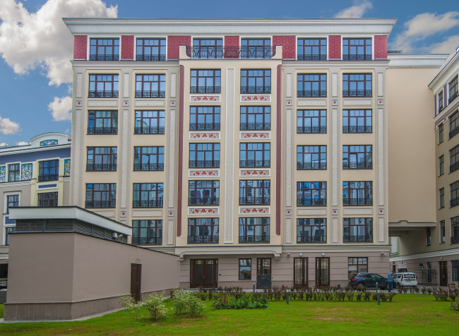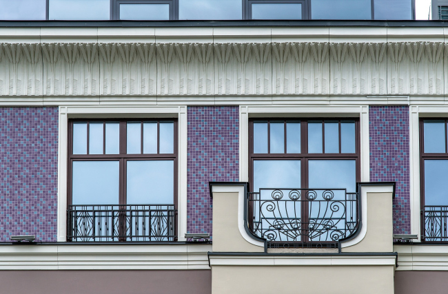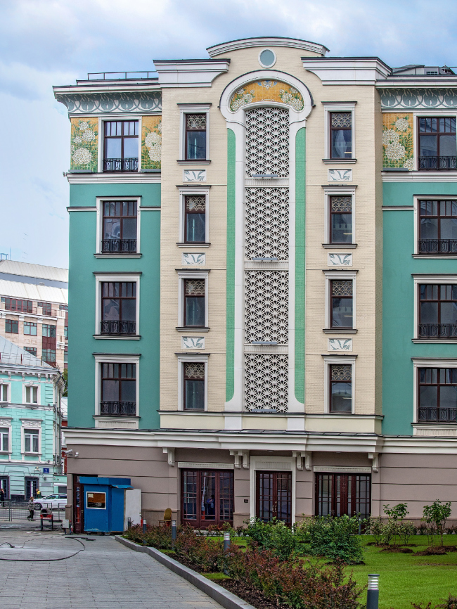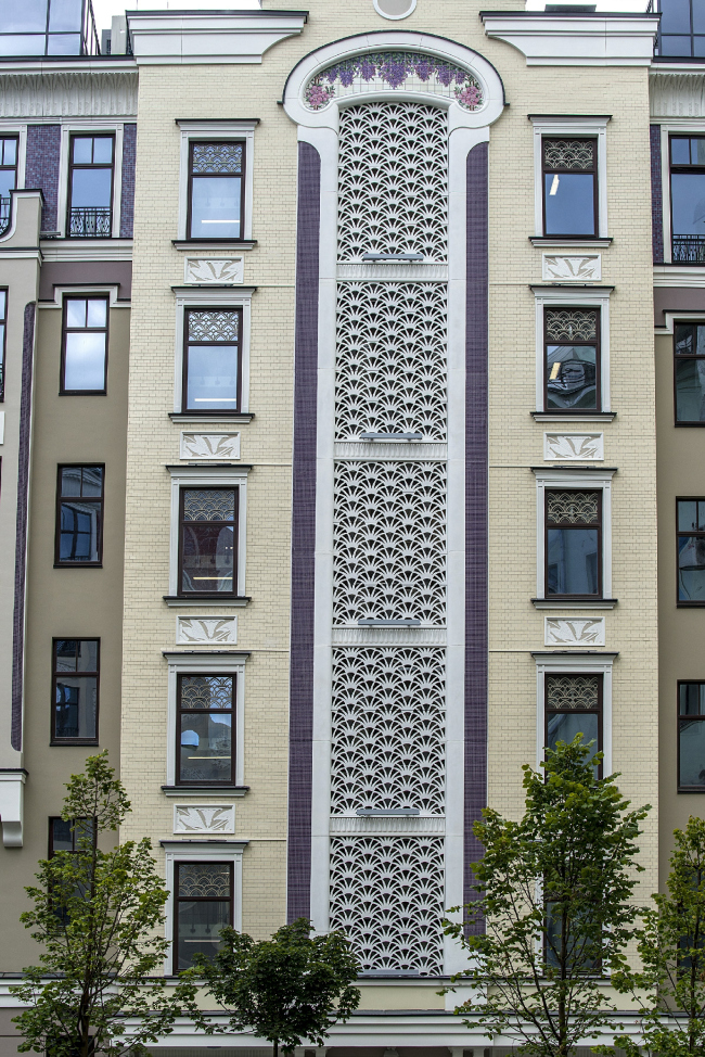 Одним из самых нарядных элементов фасадов стали панно, созданные по авторским рисункам архитектора Павла Андреева. Эти фризы с растительными и цветочными мотивами, характерными для стиля модерн конца XIX – начала XX веков, не один из которых не повторяется, изготовлены традиционным способом из керамической глазурованной плитки. Общая площадь художественных панно составляет 690 кв. м., и основной проблемой стал их монтаж на вентилируемые фасады.