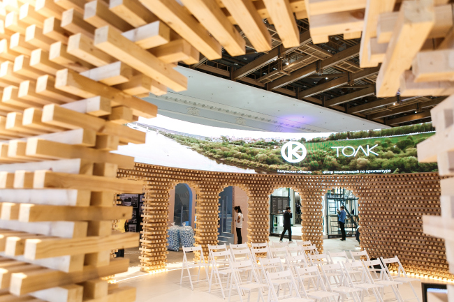 На стенде были представлены достижения и планы по развитию областного центра и области в целом в сфере архитектуры и градостроительства. Сам павильон заслуживает отдельного внимания – это настоящий арт-объект в виде деревянной ротонды. Благодаря удачному архитектурному решению и грамотной организации пространства павильона, насыщенной деловой программе и большому интересу аудитории к дискуссиям на стенде Калужской области, стенд был удостоен диплома как Лучшее общественное пространство АРХ Москвы. «Стенд создан по проекту Центра компетенций по архитектуре «ТОЛК» и сочетает в себе традиции и новые технологии. Это круглая в плане деревянная конструкция, по окружности которой спроектированы высокие арки. Стенд вручную собран из 15 тысяч деревянных брусков. Внутри павильона на цифровой панели транслируется круговая панорама города и проектные предложения благоустройства к юбилею Калуги. Стенд сборно-разборный и еще не раз представит Калужскую область на других знаковых мероприятиях в преддверии юбилея Калуги», – сообщил руководитель калужского Центра компетенций по архитектуре «ТОЛК» Александр Томашенко.