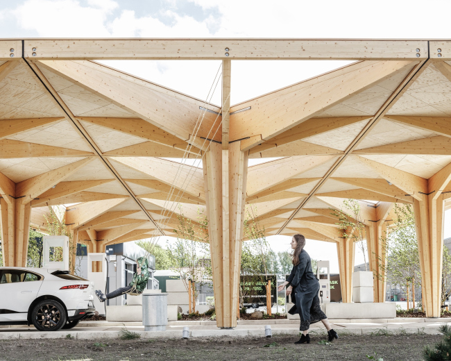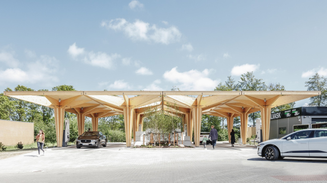 Станции из эко-сертифицированного дерева и бетона – модульные, состоящие из «деревьев» с зеленой кровлей и солнечными батареями на ней. Их можно увеличивать в размере в зависимости от потребностей, но главное – они создают спокойную и комфортную атмосферу, позволяя водителям и пассажирам отдохнуть и отвлечься от напряженного путешествия по шоссе и тем самым – в идеале – сделать дороги более безопасными. Станция зарядки электромобилей© COBE & Rasmus Hjortshøj – COAST