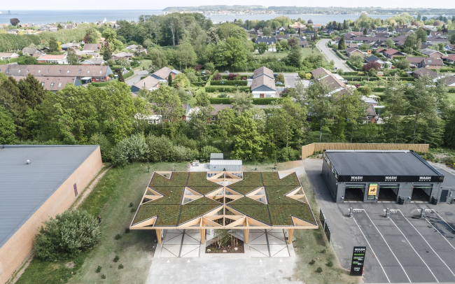 Конструкция станции рассчитана на вторичное использование и переработку, также проект включает в себя повышающее биоразнообразие озеленение, продуманное вместе с Датским обществом охраны природы.Станция зарядки электромобилей© COBE & Rasmus Hjortshøj – COAST