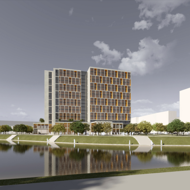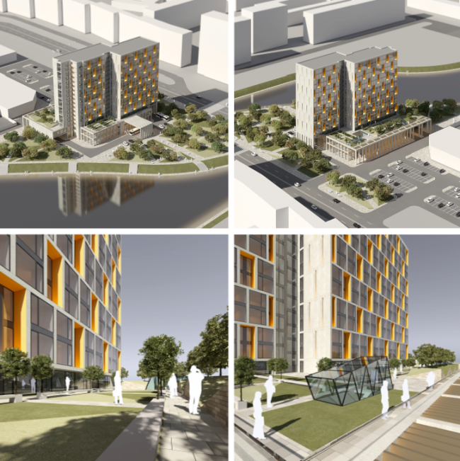 Главный вход в гостиницу находится со стороны реки, с противоположной – въезд в подземный паркинг и вход в магазин, оформленный галереей, зона погрузки – со стороны проспекта Ветеранов. Также мастерская Анатолия Столярчука предлагает благоустроить набережную реки Новой.