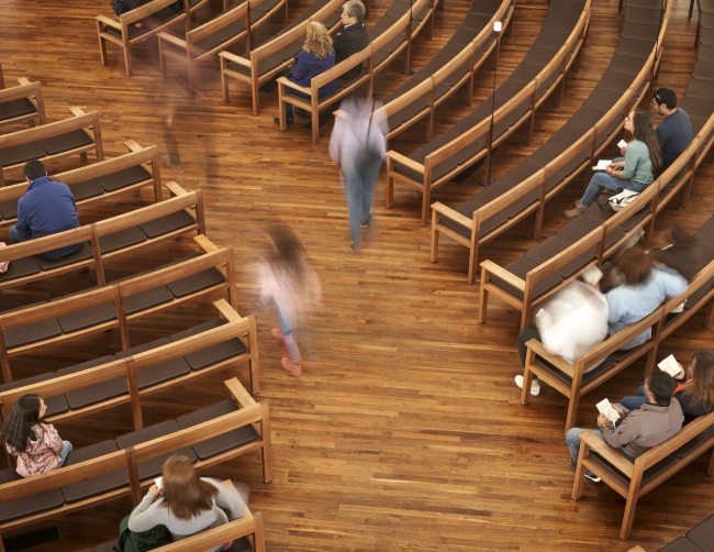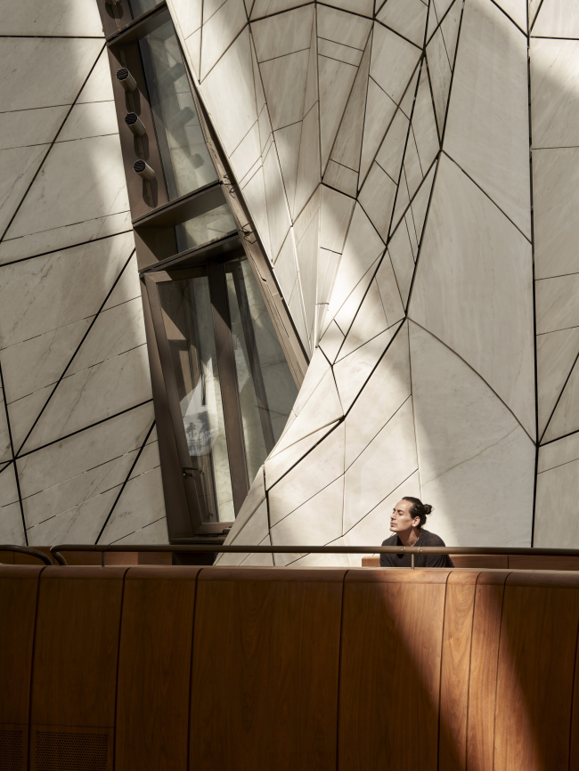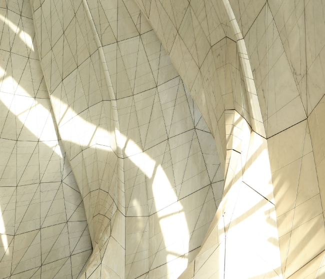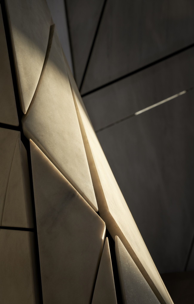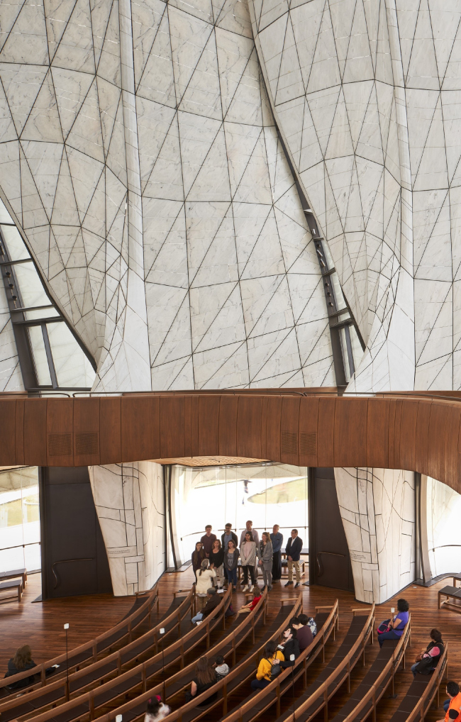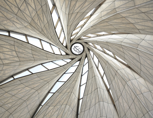 Центрическая постройка состоит из девяти «лепестков» из стекла и полупрозрачных мраморных пластин, мягко закрученных вокруг окулуса в центре. В интерьере традиционное пространство для верующих на первом этаже сочетается с ярусом хор, где можно уединиться, не оказываясь при этом в одиночестве.