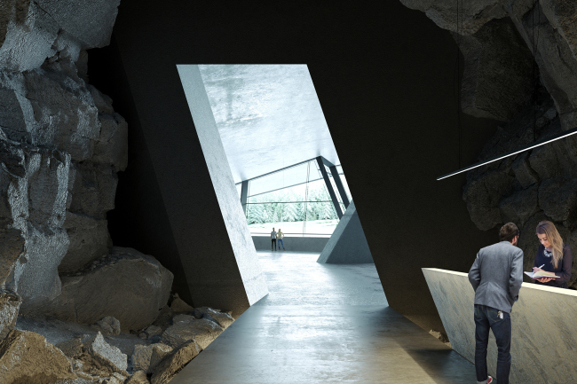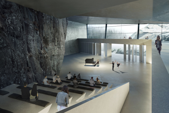 В центральном пространстве отеля среди камней находятся ресторан, бар, зона отдыха, амфитеатр со сценой и пространство для перформансов.