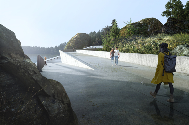 Отель выступает из рельефа и спускается террасами к воде. Скелет отеля – это путь, огибающий существующие камни, образуя смотровую тропу с яркими видами на окружающую территорию.