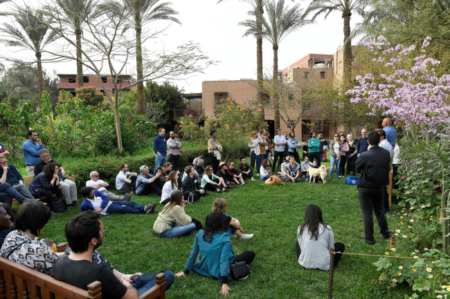Форум проходил в Каире на территории кампуса Американского университета (AUC), который содержит все приметы современного урбанизма: уютные улицы, кофе-пойнты и книжные магазины, добротные здания из местного песчаника с голубой мозаикой, с национальными исламскими мотивами. На территории университета, в отличие от остального города, женщинам можно ходить без охраны и без головных уборов.