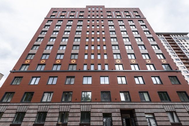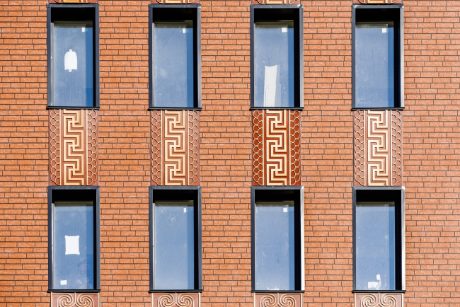 Комплекс облицован фасадными панелями KMEW высотной серии «Серадир V» HCW2324GC с фактурой керамического кирпича насыщенного красного цвета с тёмными швами. На вставках использованы элементы из стеклофибробетона, которые создают выразительные акценты на фасаде, а первый этаж отделан натуральным камнем.