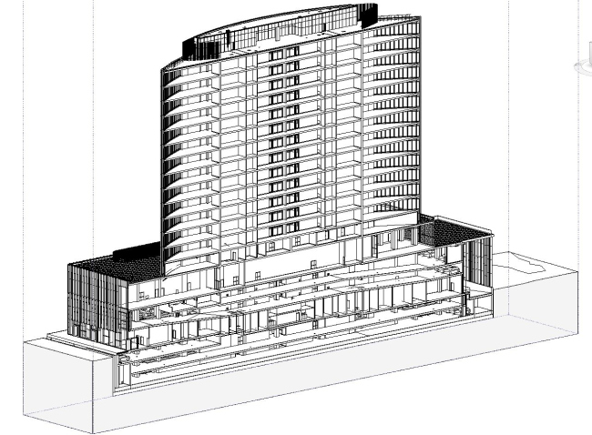 Вместе с тем, согласно пожеланию заказчика, который проводил закрытый конкурс на проект бизнес-центра, на этом месте должно было возникнуть высотное здание с достаточно высокими ТЭПами. Очевидно, что самым простым решением было бы создание вытянутого параллелепипеда, этакого сундука, занимающего всё пятно участка. Но архитекторы UNK project предложили элегантное решение, позволяющее соблюсти интересы заказчика и в то же время сохранить баланс с окружением: 14-этажная линза возносится на четырехэтажном основании.