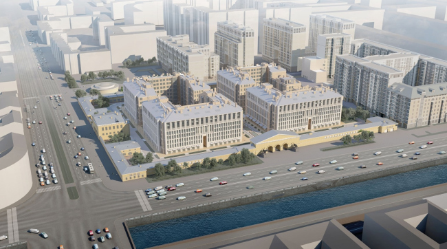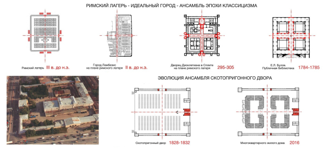 Проект ЖК на Московском проспекте – один из примеров драматической и сложно сформированной «легенды», сплетающей в единую архитектурно-градостроительную систему военные лагеря древних римлян, антураж торговли скотом в XIX веке, непростую судьбу классицизма в России, сохранение памятников и симбиоз с ними, странную популярность псевдонеоклассики 1950-х годов, новые представления о стандартах современного жилья. Внутри историиСейчас место, выделенное под строительство жилого комплекса на пересечении Московского проспекта и Обводного канала, рядом с метро «Фрунзенская», считается вполне престижным. А когда-то, в начале XIX века, это были почти выселки, граница настоящего города и окружающих его пригородов, откуда в столицу прибывали продукты и прочие товары. Некоторые из них имели особые требования к транспортировке и хранению. Ежедневные потребности города в говядине составляли несколько тысяч голов, для размещения и перепродажи которых в 1826 году по проекту архитектора Иосифа Ивановича Шарлеманя был построен «Скотопригонный двор». Видимо, в связи с расположением двора на границе с «дикими» болотами и лесами или в связи с личными вкусами и амбициями архитектора была выбрана планировочная схема древнеримского военного лагеря с двумя перпендикулярными осевыми улицами – кардо (север-юг) и декумануса (запад-восток), с расходившимися по обе стороны последнего сдвоенными рядами прясел для 5000 рогатых постояльцев. С трех сторон двор был окружен периметральным корпусом шириной 6 метров, представлявшим нечто среднее между оградой и складом. По центру его северной и южной стороны были построены трехарочные с низким фронтоном ворота, а в центре восточной стороны, с выходом на будущий Московский проспект, располагался двухэтажный главный корпус. Стилистически все сооружение было «одето» в торжественные неоклассические одежды, причем, по мнению экспертов, в архитектуре заметен переход от Александровского классицизма с его древнегреческими аллюзиями, к русскому ампиру с его романофилией. Этим он особенно ценен.