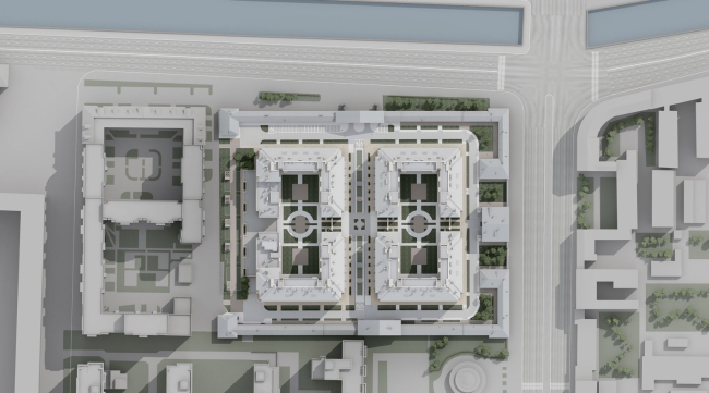 Непреодолимая логика планировки и сила ортогоналей позволила предложенной в самом начале работы над проектом структуре пережить смену двух застройщиков, явно оценивших не столько ее классическую чистоту и связь с историческими прототипами, сколько эффективность выхода площадей, перспективы для сдачи в аренду общественных первых этажей и априори решенной проблемы внутриквартальной безопасности.