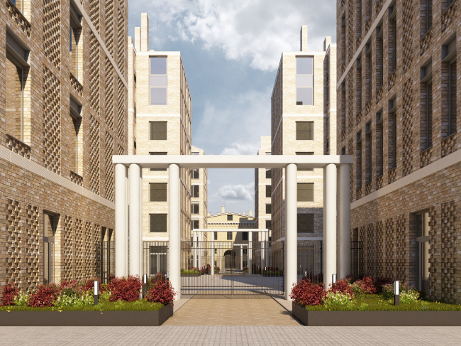 Город с открытыми воротами, или сила ортогональной планировкиТерриторию жилого комплекса пересекают две перпендикулярные улицы, две композиционных оси, из которых главная роль отдана оси север-юг. Широкий променад оформлен как бульвар, идущий от въездной арки со стороны Обводного канала, сохраненной в стилистике проходной Молокозавода (проект В. А. Матвеева), до исторических корпусов. К сожалению, южные ворота немного не совпадают с осью, но это не сказывается на общей композиции бульвара, по центру которого организованы приподнятые клумбы с деревьями и ажурными перголами. Перпендикулярная ей ось, проходящая с востока, от Московского проспекта и Главного корпуса на запад, пронизывает два основных корпуса (блок «А» и блок «Б»), оставляя в них широкие проходы. Архитекторы решили не перекрывать их арками и ограничиться лишь декоративными порталами, стилизованными под упрощенную ордерную систему.