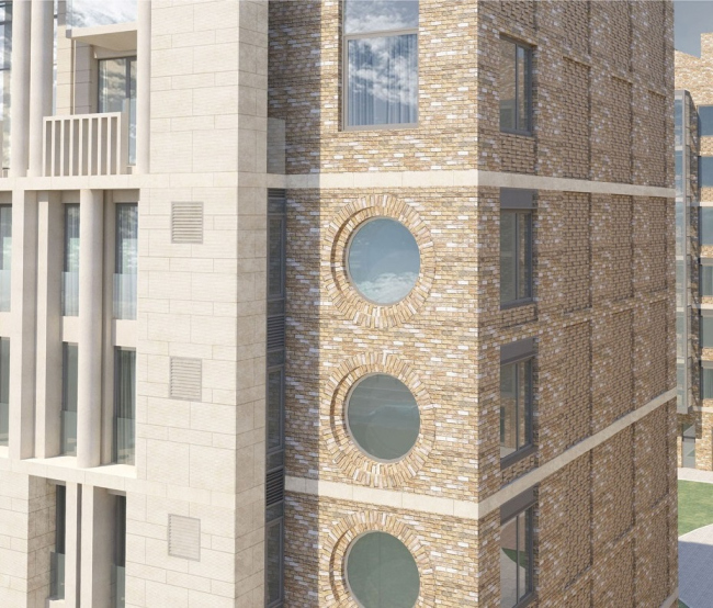 Не удивительно, что дворовые и выходящие на осевые променады фасады решены в лицевом кирпиче и каменные ордерные отголоски на них в виде поясов и пилястр лишь служат напоминанием о торжестве строя и ритма их нарядных собратьев, работающих «лицом» жилого комплекса. Тем не менее, заданная снаружи структура сохраняется и здесь. Меняется только способ ее презентации. К уже упомянутым декоративным каменным «гостям», добавляются чисто кирпичные приемы, такие как чередование структурной и гладкой кладки, напоминающие о пилястрах.*** В результате жилой комплекс воспринимается очень цельно. Выразительность декларированного авторами приема и сдержанность в его трактовке помогают сформировать гармоничный ансамбль. Монолитные объемы, одетые в ордерные структуры, поднимающиеся над историческими стенами, несмотря на кажущуюся компактность, особенно на фоне растущих на дальнем плане новостроек высотой под 60 метров, претендуют на роль полноценной градостроительной доминанты. Жилой комплекс, словно остров или скорее форпост отмечает границу между старым и новым городом, соединяет традиционную и новую петербургскую архитектуру.