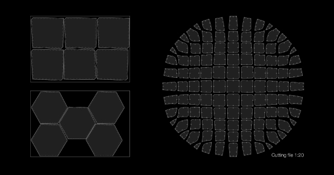 Павильон был смоделирован на компьютере, заранее были рассчитаны размеры и формы панелей и места для крепежа. Именно благодаря 3D-моделированию удалось отойти от пяти- и шестиугольников и сгенерировать оболочку, основанную на ромбах – четырехугольники более удобны в промышленном производстве и к тому же экономичней. Так на «Каплю» ушло на 30% меньше материала, чем при строительстве аналогичного «классического» купола из пяти- и более угольников. Все фрагменты вырезаны при помощи фрезерного станка с ЧПУ.
