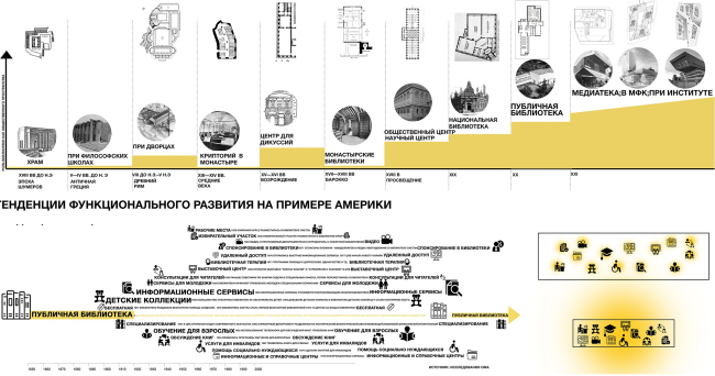 Основная особенность в функционально-пространственной структуре библиотек – появление блока внеинформационных функций. Экспериментальные модели показывают, что современная библиотека успешно адаптируется к российским градостроительным условиям, улучшая социальную жизнь районов, создает культурную децентрализацию.