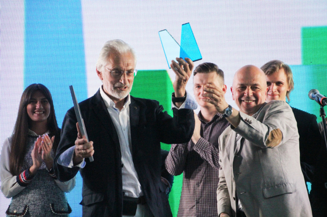Вручали, к слову, дипломы по двое – Владимира Плоткина наградили Юлия Бурдова из Buromoscow, лауреат прошлогодней премии, и Николай Шумаков, который вначале с экрана, потом со сцены прокомментировал: за что ни возьмется ТПО «Резерв», все отлично получается.
