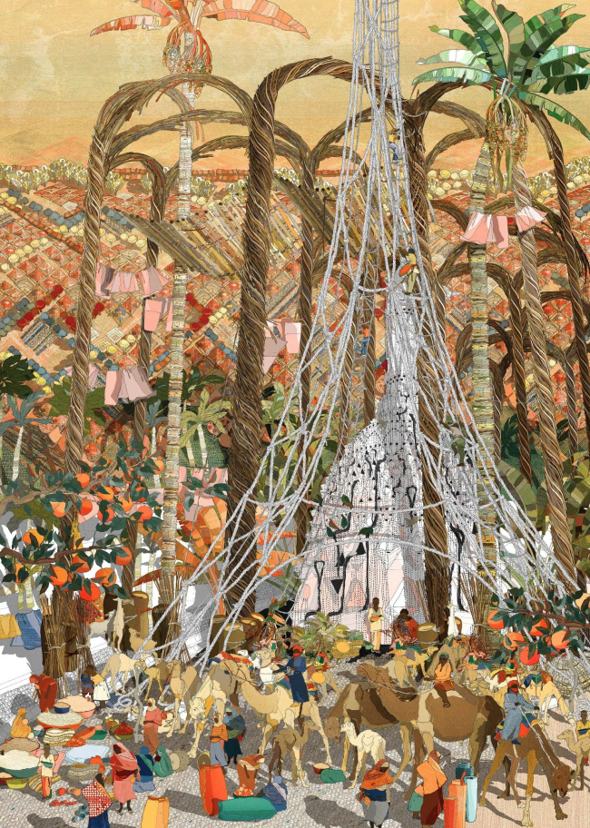 Работа в стиле персидской миниатюры «Большой Париж Нигера» Анны Андроновой из бюро Ах!Ох!Ух!, изображающая верблюдов вокруг Эйфелевой башни и что-то вроде Нотр-Дама с минаретом, – попытка затормозить миграцию посредством построения Другого Парижа для на путях движения народов. Но если не знать, что это клон французской столицы, это выглядит как исламское будущее старого Парижа, где выросли тропические леса из-за глобального потепления. Возможна аллюзия на скандальный роман Уэльбека «Покорность», но без его цинизма. Контраст ювелирной красоты и сомнительности самого события впечатляет. Кстати, жанр фантастики для молодых архитекторов понятен и органичен. Размышлениям об Ух!-будущем они предаются с интересом и без фобий.