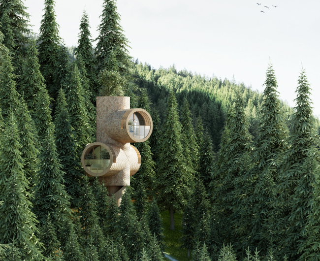 Австрийские архитекторы Precht представила новую концепцию «дома на дереве»: жилища, которое имеет якобы нерукотворную природу и растет в лесу само по себе. Постройка, получившая имя «Берт», повторяет структуру дерева; в «стволе» расположены технические помещения, а выше, в «ветвях» – функциональные. Заказчиком проекта стал стартап Baumbau, который специализируется на мини-домах. К реализации проекта он планирует приступить весной 2020-го.