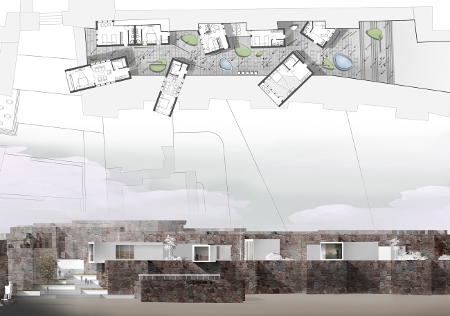 Юрий Сафронов: «Аня Погосян выбрала очень важную и интересную тему. Она вывела принципы создания новой уникальной среды временного пребывания, позволяющие сочетать интересы сохранения исторического ландшафта и развития туризма. Работа Ани сложна, многогранна, а графическое решение обладает присущим ее предыдущим проектам изяществом».*** Типология и локализация гостиничных комплексов как импульс в социальной и туристической жизни АрменииАня Погосян