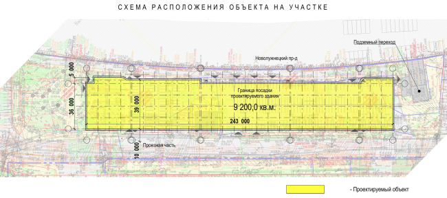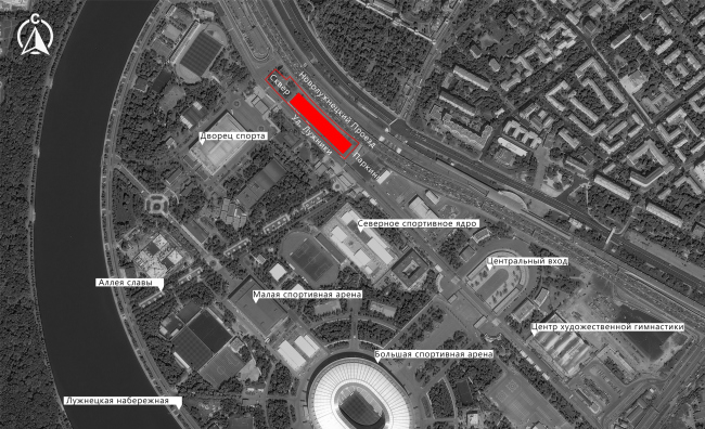 Участок – нынешняя парковка между ТТК и Лужнецкой улицей, – длинный, с соотношением сторон 1:5, высотное ограничение – 27 м, связано с соседством Новодевичьего монастыря. Лужнецкая улица сравнительно неширокая, 35 м, ограничивающая участок с противоположной стороны высокая эстакада с парковкой под ней в принципе не предполагает дальнего обзора. Между тем здание центра Единоборств представляет собой композиционную пару недавно центру гимнастики Ирины Винер, заметному благодаря венчающей фасад волне-ленте.
