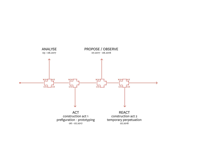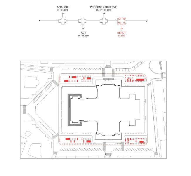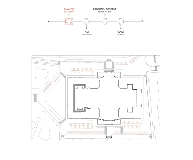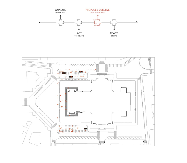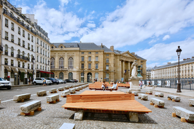 Анализ весной 2017-го стал первым этапом работы архитекторов, обосновавшихся на площади в контейнере-киоске (такие были выделены мэрией для всех семи объектов программы Идальго). Затем, летом, был реализован пробный проект – для тестирования идей архитекторов и сбора отзывов горожан. Важным принципом был максимум вариантов использования при минимуме средств. «Вторсырье» для него нашлось на складах столичной администрации: гранитный бортовой камень был использован в виде скамей на деревянных подставках или же как опоры для деревянных же платформ. Еще одной формой городской мебели стал длинный стол с лавками. В качестве спинок на платформах применили еще одну находку на складе – ренессансные (Пон-Неф), которые заменили на новые при его перестройке в XIX веке.