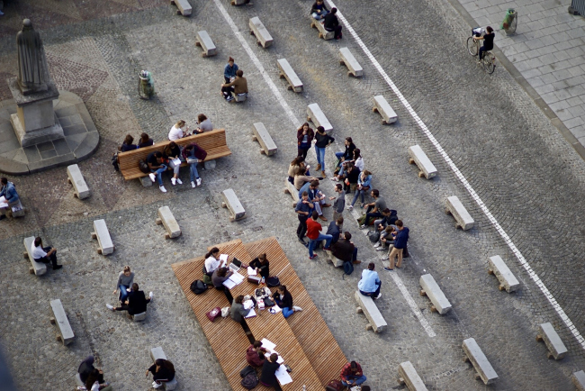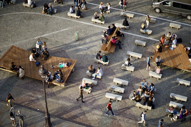 Ограничение движения автомобилей сразу снизило уровень шума (и при этом ощущения небезопасности), что важно для качественного общественного пространства. Были продуманы варианты маршрутов через площадь – на выбор пешеходов, а также созданы отдельные зоны по типу «меблировки». Блоки-скамьи понравились парам или одиночкам, на платформах располагались группы или пары. Зато длинный стол привлек сразу всех пользователей, включая «самостоятельных» женщин, что сделало его местом общения между незнакомыми людьми.