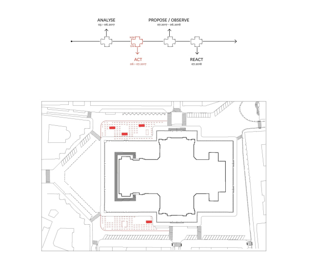 Анализ весной 2017-го стал первым этапом работы архитекторов, обосновавшихся на площади в контейнере-киоске (такие были выделены мэрией для всех семи объектов программы Идальго). Затем, летом, был реализован пробный проект – для тестирования идей архитекторов и сбора отзывов горожан. Важным принципом был максимум вариантов использования при минимуме средств. «Вторсырье» для него нашлось на складах столичной администрации: гранитный бортовой камень был использован в виде скамей на деревянных подставках или же как опоры для деревянных же платформ. Еще одной формой городской мебели стал длинный стол с лавками. В качестве спинок на платформах применили еще одну находку на складе – ренессансные маскароны с Нового моста (Пон-Неф), которые заменили на новые при его перестройке в XIX веке.