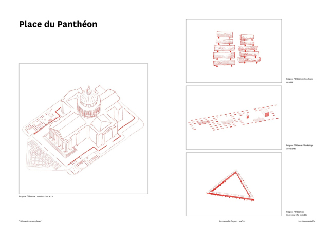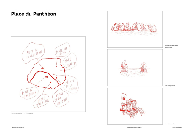 Команда Les MonumentalEs во главе с ландшафтными архитекторами Emma Blanc Paysage включает также архитекторов и строителей Collectif Etc, графического дизайнера Эммануэль Гийяр (Emmanuelle Guyard), специалистов по гендерным вопросам Genre et Ville, бюро по социальной интеграции и устойчивости Albert & Co. Этой команде были поручены площади Пантеона и Мадлен.