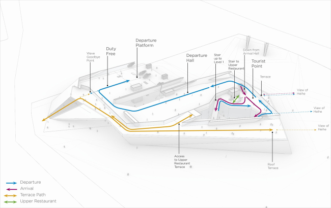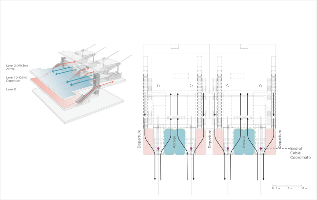 Оператором закрытого конкурса на проект терминала выступило КБ «Стрелка», оно же разрабатывало экономическую и функциональную модель для будущей постройки. К участию пригласили 12 архитектурных мастерских, представить концепцию в итоге предложили только UNStudio и Coop Himmelb(l)au. Ставшее победителем голландское бюро в последние годы работало над проектами канатных дорог в и .