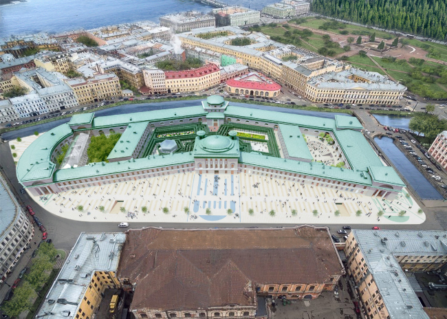 Студия Сергея Мишина рассматривает Конюшенное ведомство как звено, которого недостает для появления петербургского музейного квартала. Если внутри разместить Музей современного искусства, а в развитие территории включить расположенные через площадь Конюшенный музей и двор, то получится единый пешеходный маршрут от Эрмитажа до Русского музея – и с современным «блоком» посередине.