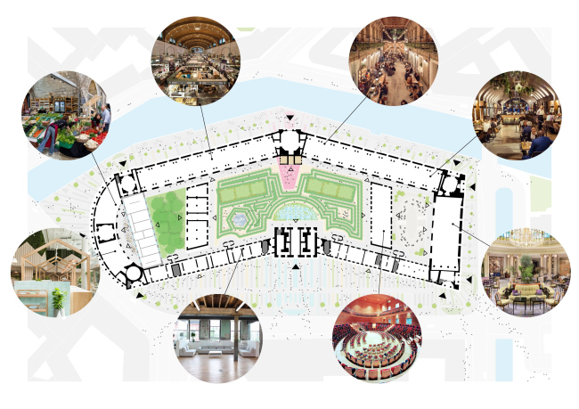 Первый этаж Конюшенного ведомства превратится в рынок: специй, кофе, сладостей, рыбы и фермерских продуктов. Семь угловых павильонов станут входными группами, у каждой своя функция, тоже в основном связанная с едой: пекарня, устричный бар, шампанерия, сигарный клуб, кофейня, цветочный магазин и главный вход с храмом, который на этом празднике жизни кажется чуть лишним. Второй этаж займут коворкинги, офисы и студии художников.
