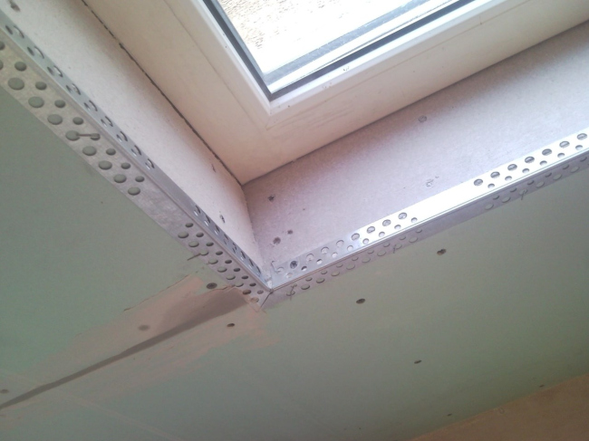 Из гипсокартона. Материал используется исключительно внутри помещения. Отличается очень низкой стоимостью, что делает его доступным и востребованным. В основном предназначен для отделки окон с прямыми углами: гипсокартон разрезается на части, прикрепляется к поверхности и заштукатуривается. Его не используют для откосов сложных по форме окон. Отделка по итогу будет вмещать несколько слоев: сам материал, грунтовка, штукатурка и финишная краска.