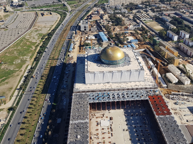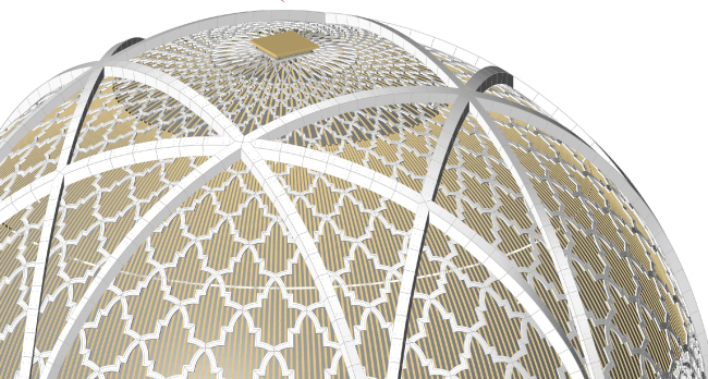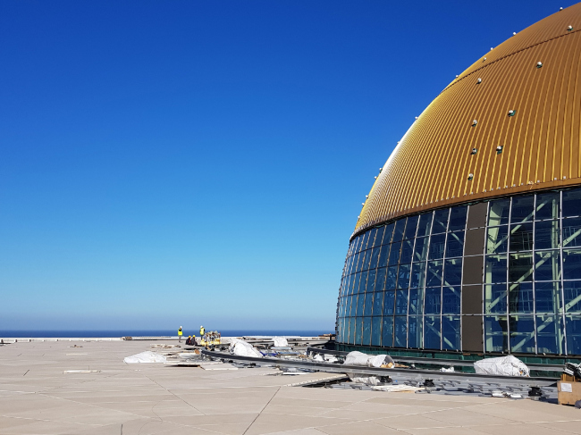 Полную водонепроницаемость алюминиевой кровли гарантирует система Riverclack® с эксклюзивной окраской “Graceful Gold”. В ближайшее время на кровлю с помощью специальных суппортов будут установлены декоративные элементы из фиброцемента. Для реализации сферической формы купола потребовались инновационные кровельные картины Rivercalck® Sihouette (Силуэт), специально разработанные для устранения трудностей, связанных с двойной кривизной.