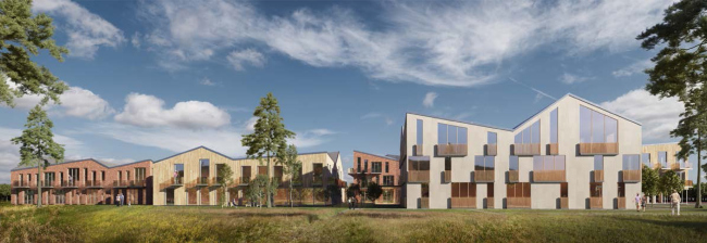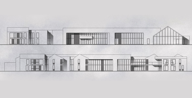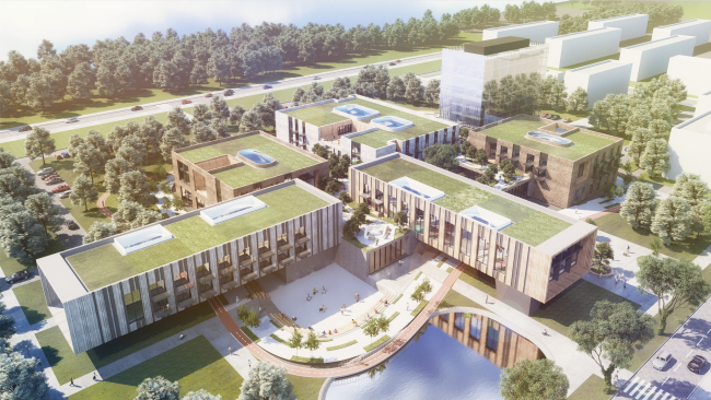 Предложена «бескоридорная» планировка, отдельный акцент сделан на обилии естественного освещения: световые фонари, сплошное остекление общественных зон, окна в пол и зенитные. Базовая высотность 2 этажа и силуэт со скатной кровлей придают комплексу черты традиционной архитектуры, что на фоне преобладающей в нашей стране типовой застройки послевоенного периода будет выглядеть скорее инновационным, чем консервативным.
