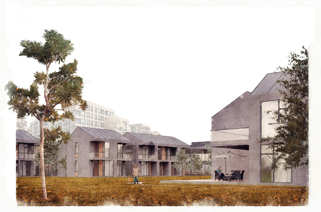 Ярославское бюро DK architects Григория Дайнова сделало акцент на универсальности прямоугольных блоков с плоской кровлей, чья форма перекликается с типовой малоэтажной застройкой, широко распространенной в городах РФ. Но, в отличие от последней, в проекте активно использованы преимущества плоской кровли: эксплуатируемая, зеленая, там размещен сад-огород, столь любимый пожилыми людьми. Он компенсирует отсутствие или недоступность дачи или приусадебного участка, – справедливо поясняют авторы, отдавая этой части значительную площадь, фактически равную этажу всего здания.