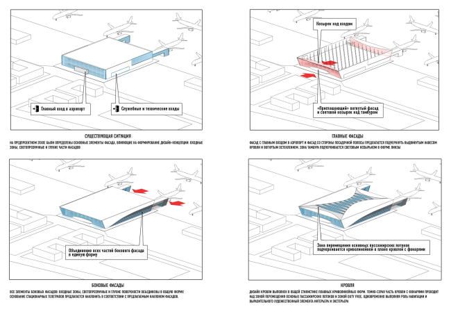Впрочем включение космической тематики не потребовало кардинальных изменений: ассоциации с воздушными потоками оказались также уместны и легко считываемы – в складчатом витраже теперь видится пульсация потока плазмы или протуберанцы горячего воздуха, возникшие от реактивных двигателей. А в металлической облицовке фасадов – сходство с корпусом ракеты. Космические аналогии усилятся, когда над входным тамбуром главного фасада появится похожий на «дирижабль» консольный козырек.