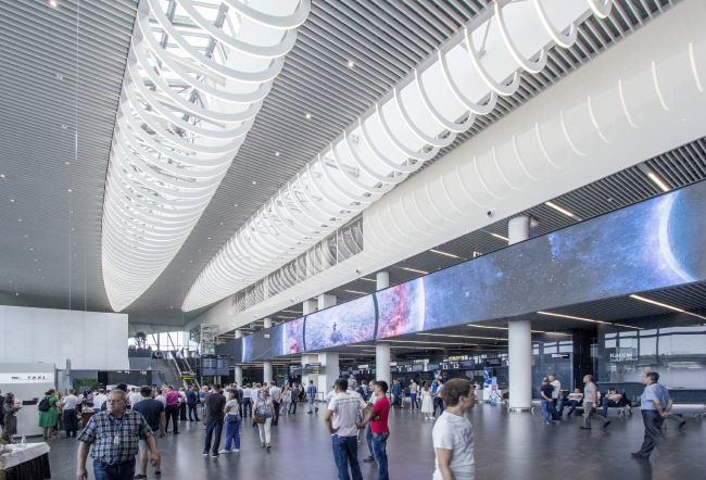 В результате родилась идея огромной медиа-ленты, экрана, закрывающего бортик антресольного этажа, выходящего в основной двусветный зал терминала. Размеры экрана позволяют ему доминировать в пространстве, но, благодаря тонко срежиссированному командой «Радуга-дизайн» видео-ряду, не подавлять его визуально. Основной информационный контент сосредоточен с оборотной стороны экрана, на специальном столе-стенде, идущем по краю балкона. Здесь можно ознакомиться с тем, как мечты о космосе отразились на творчестве многих русских философов, ученых, художников и архитекторов, пока во второй половине XX века, после полета Гагарина, не стали частью повседневной жизни, дав имена детским игрушкам, моделям пылесосов и так далее. Несколько дополнительных объектов и инсталляций нашли свои места в разных зонах аэропорта. Например, на антресольном этаже вылетающих пассажиров встречает настоящая посадочная капсула, точно такая же, как та, в которой приземлился Гагарин. А на выходе на посадку, в коридоре, ведущем в самолет, установлена медиа-инсталляция со стенограммой обратного отсчета и тех команд, которые получал Гагарин из центра управления полетом.