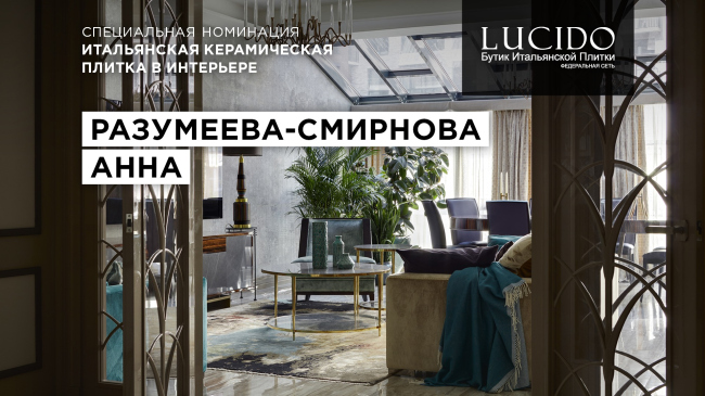 Владелец федеральной сети бутиков итальянской плитки LUCIDO Денис Ланкин поздравил лауреата спецноминации от компании LUCIDO «Итальянская керамическая плитка в интерьере» и вручил кубок дизайнеру и декоратору Анне Разумеевой-Смирновой за квартиру площадью 230 кв.м в Москве.