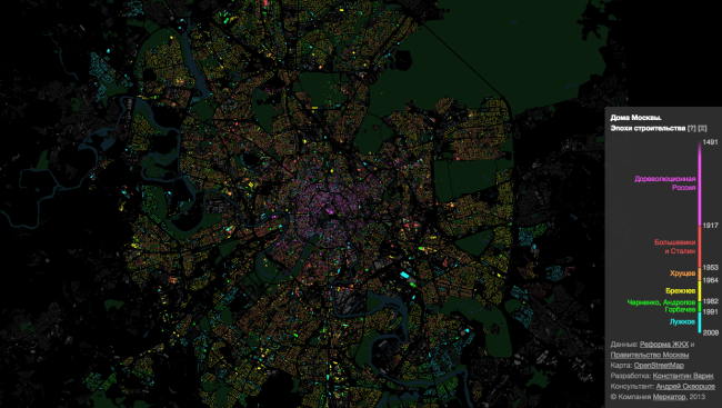Для удобства изучения карты, история жилой застройки столицы делится на 8 этапов: Российская империя (1785-1917); Ленин (1917-1924); Сталин (1925-1953); Хрущев (1954-1964); Брежнев (1965-1982); Андропов, Черненко, Горбачев (1983-1991); Лужков (1992-2010); Собянин (2011-2018).