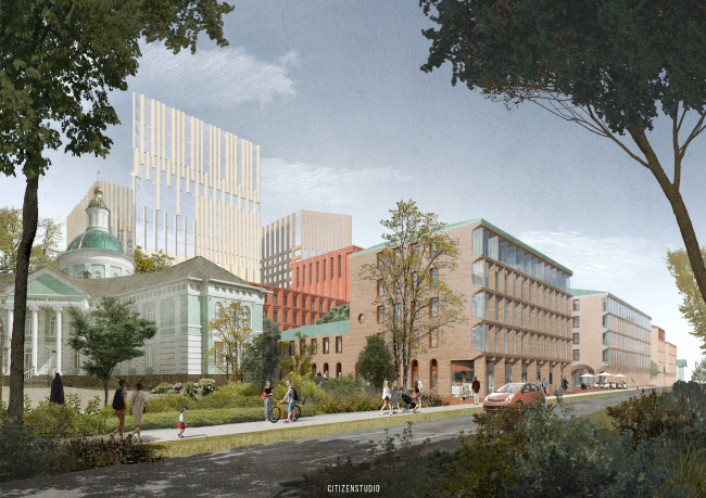Суть концепции Citizenstudio ясна из ее названия – «Четыре двора». Среди ключевых тезисов проекта: дворы комфортного городского масштаба, постепенное повышение высотности зданий (от 2 до 20 этажей), внутриквартальные пешеходные связи, единое общественное пространство, возможность поэтапной реализации.